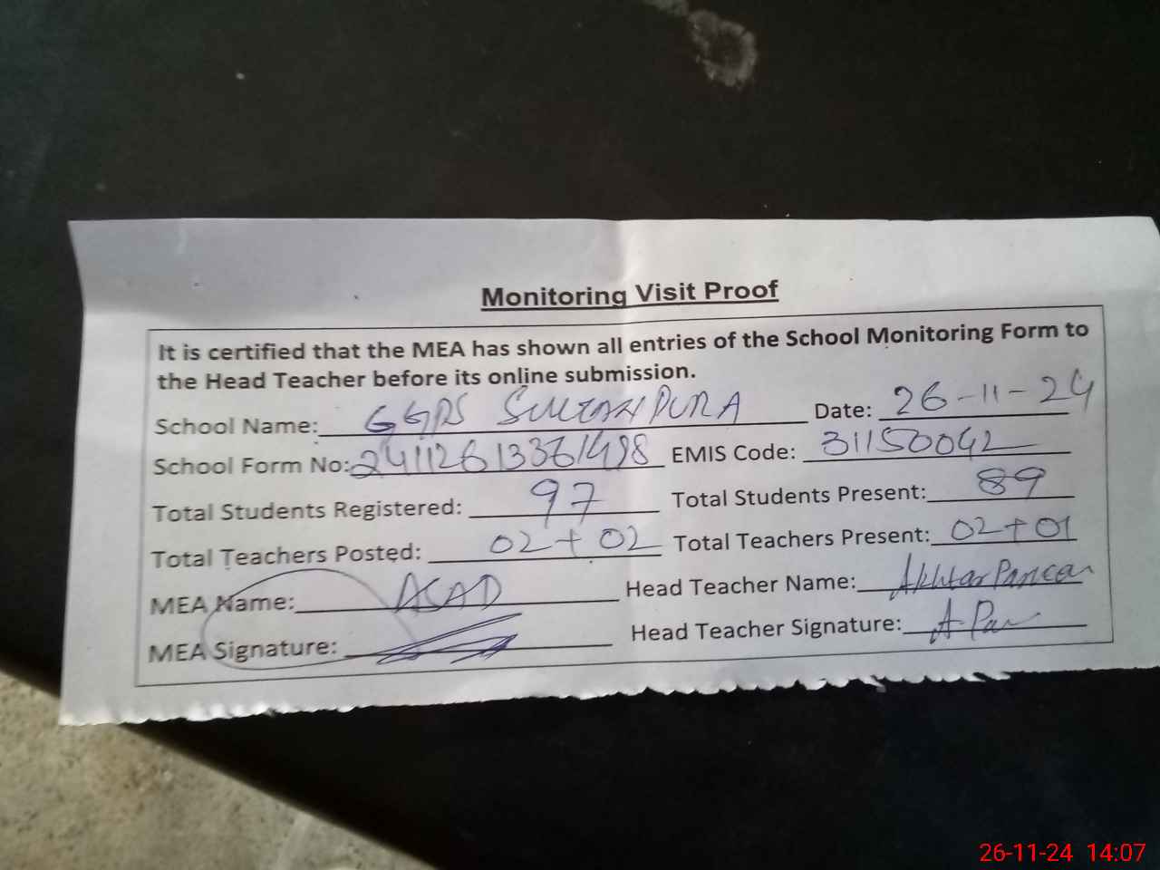 | Attendance Register | Head Teacher | MEA with School | Visit Proof |