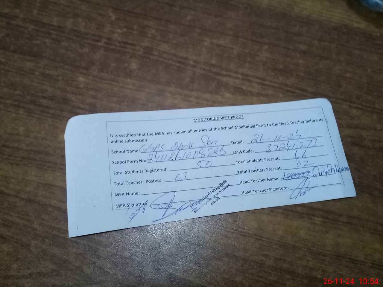 | Attendance Register | Head Teacher | MEA with School | Visit Proof |