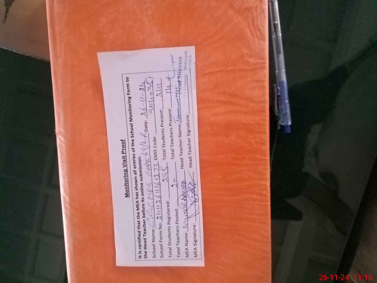 | Attendance Register | Head Teacher | MEA with School | Visit Proof |