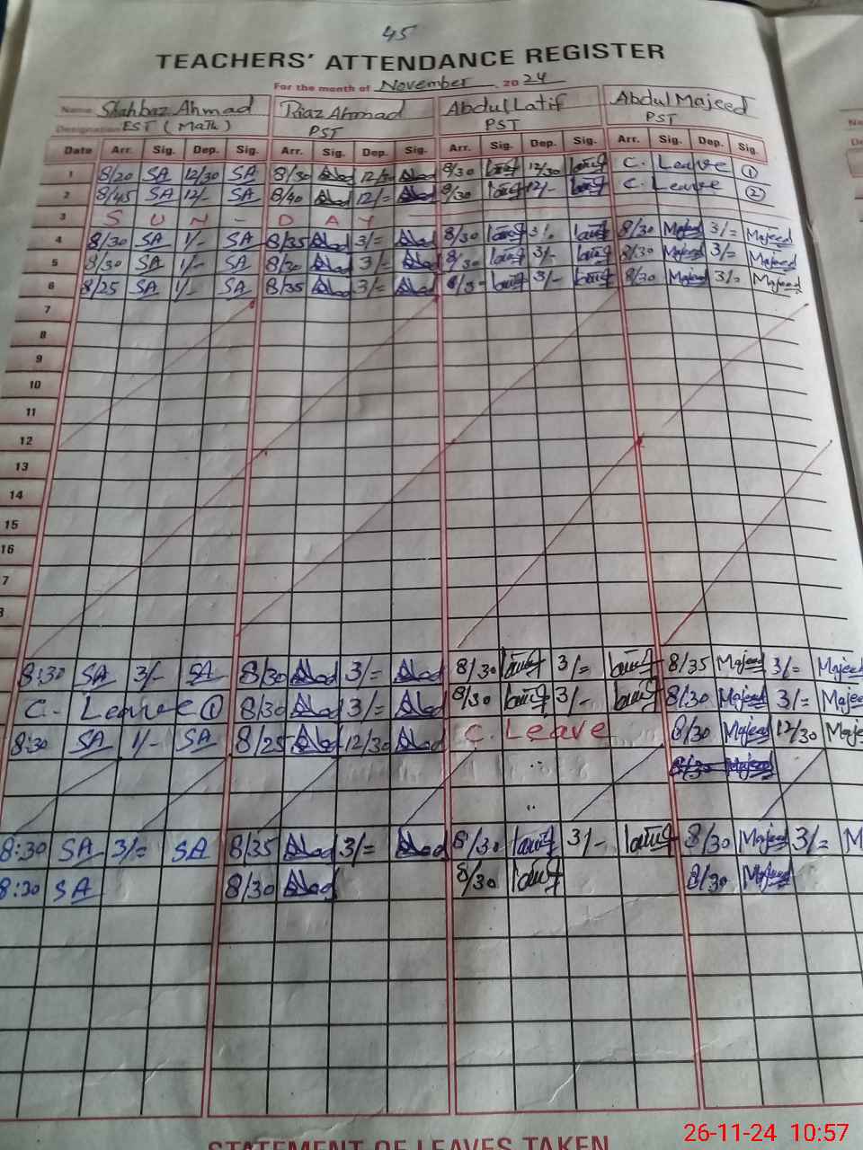 | CNIC | Full Name | Designation | R/C | Absence During Last Calender Month |