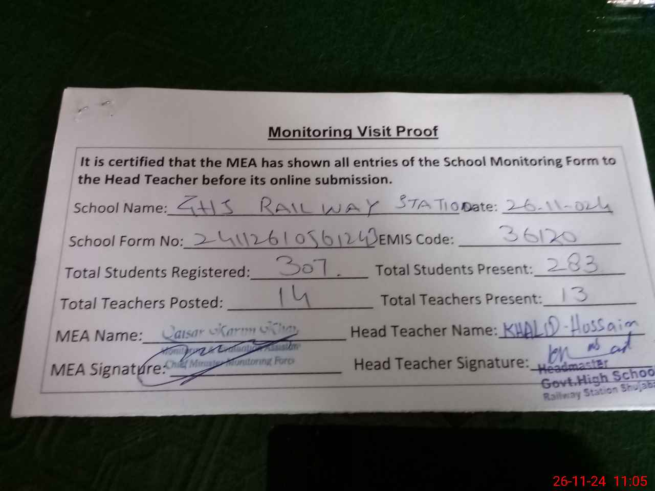 | EMIS Code: 36120029 | Name of School: GHS RAILWAY STATION SHUJABAD | |||