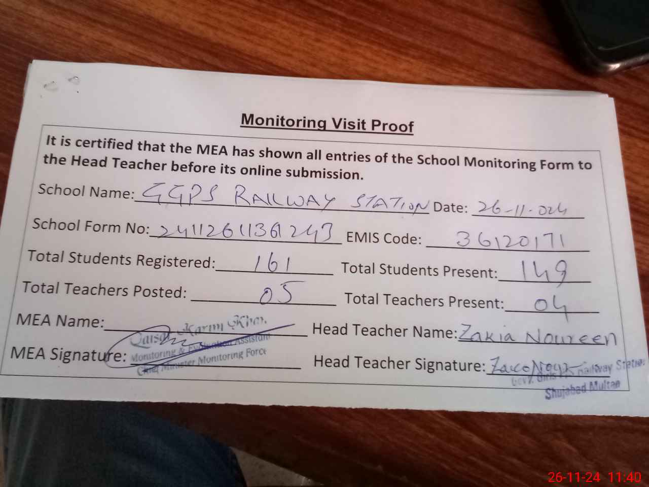 | Monitoring Date: 26-11-2024 | Start Time: 26-11-2024 11:23 AM | End Time: 26-11-2024 11:40 AM | Name of MEA: Qa**** Ka**** Kh**** | |