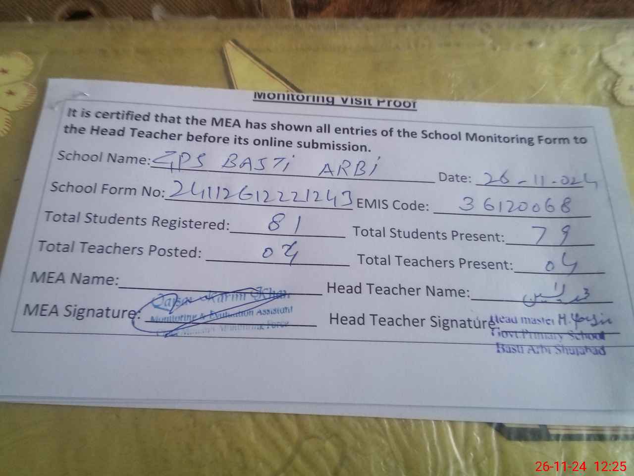 | Attendance Register | Head Teacher | MEA with School | Visit Proof |