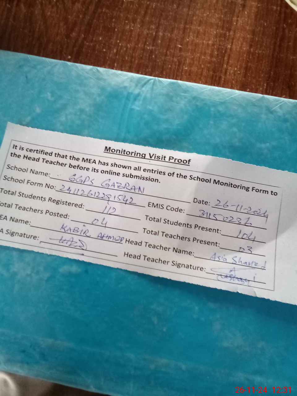 | Attendance Register | Head Teacher | MEA with School | Visit Proof |