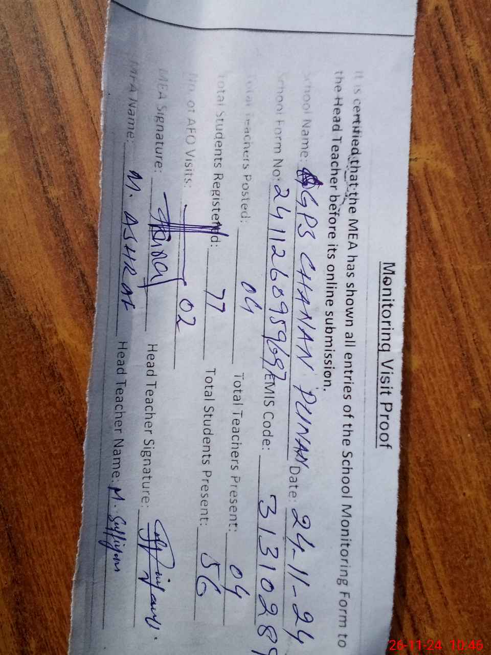 | Attendance Register | Head Teacher | MEA with School | Visit Proof |