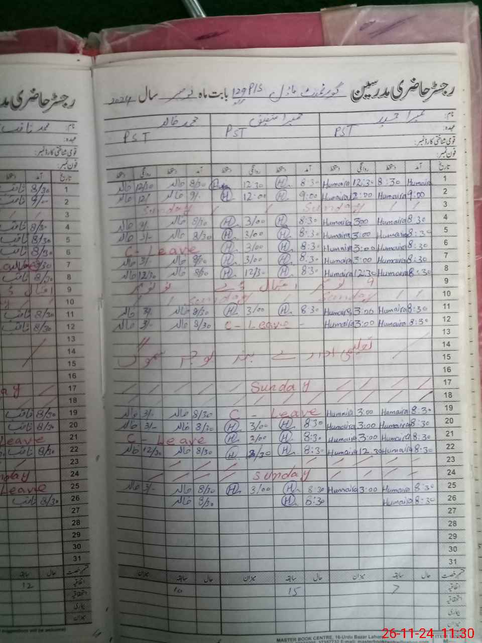 | CNIC | Full Name | Designation | R/C | Absence During Last Calender Month |