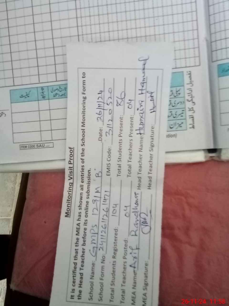 | Attendance Register | Head Teacher | MEA with School | Visit Proof |