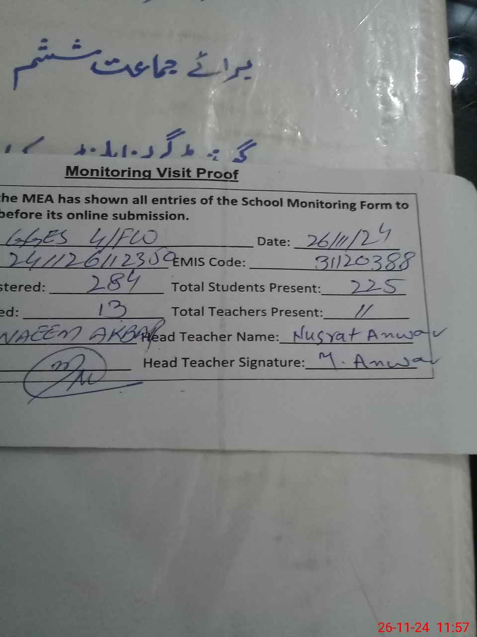 | Attendance Register | Head Teacher | MEA with School | Visit Proof |