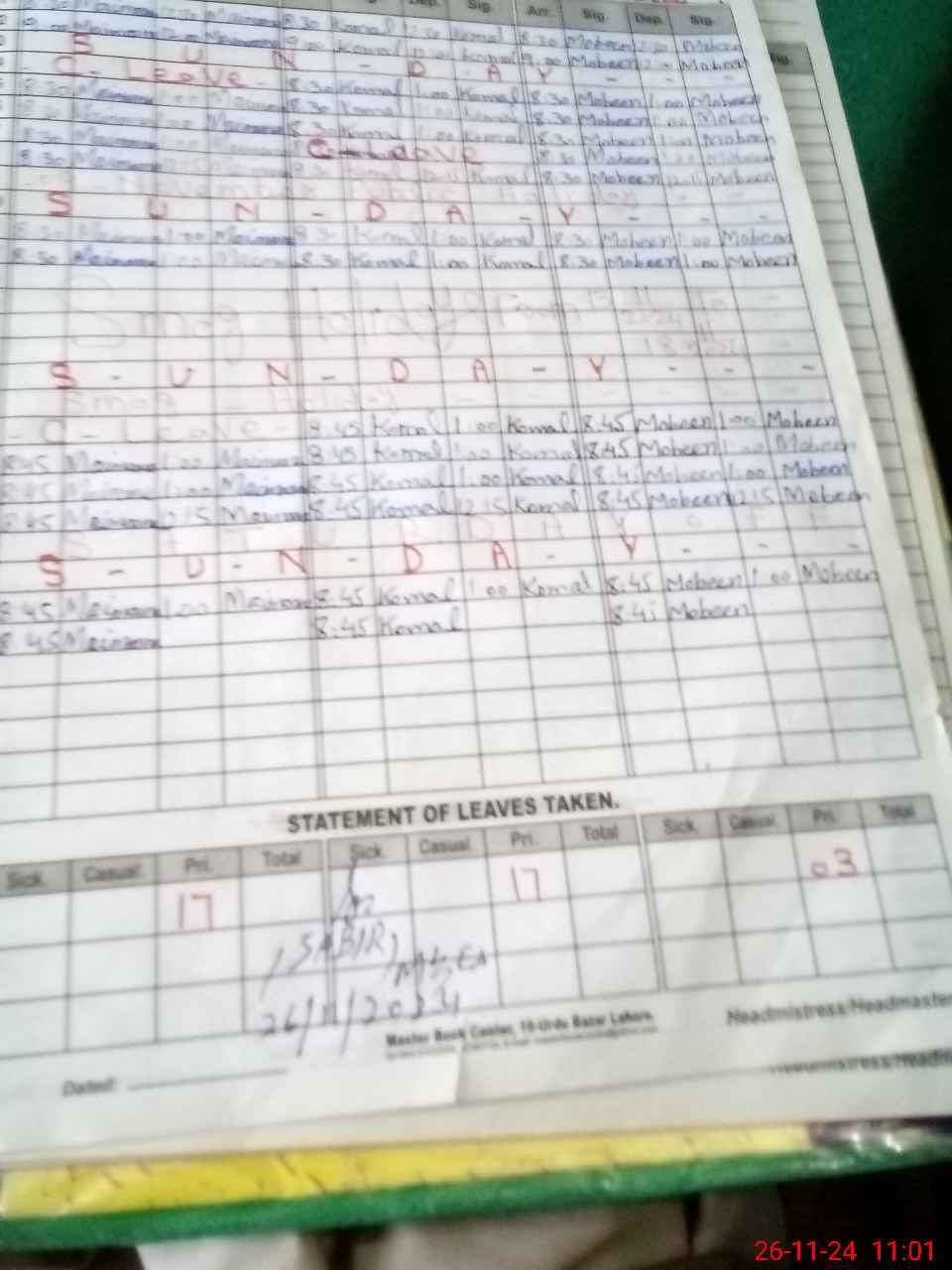 | Leave | Duty | Absent | Maternity | Medical | Ex- Pak |