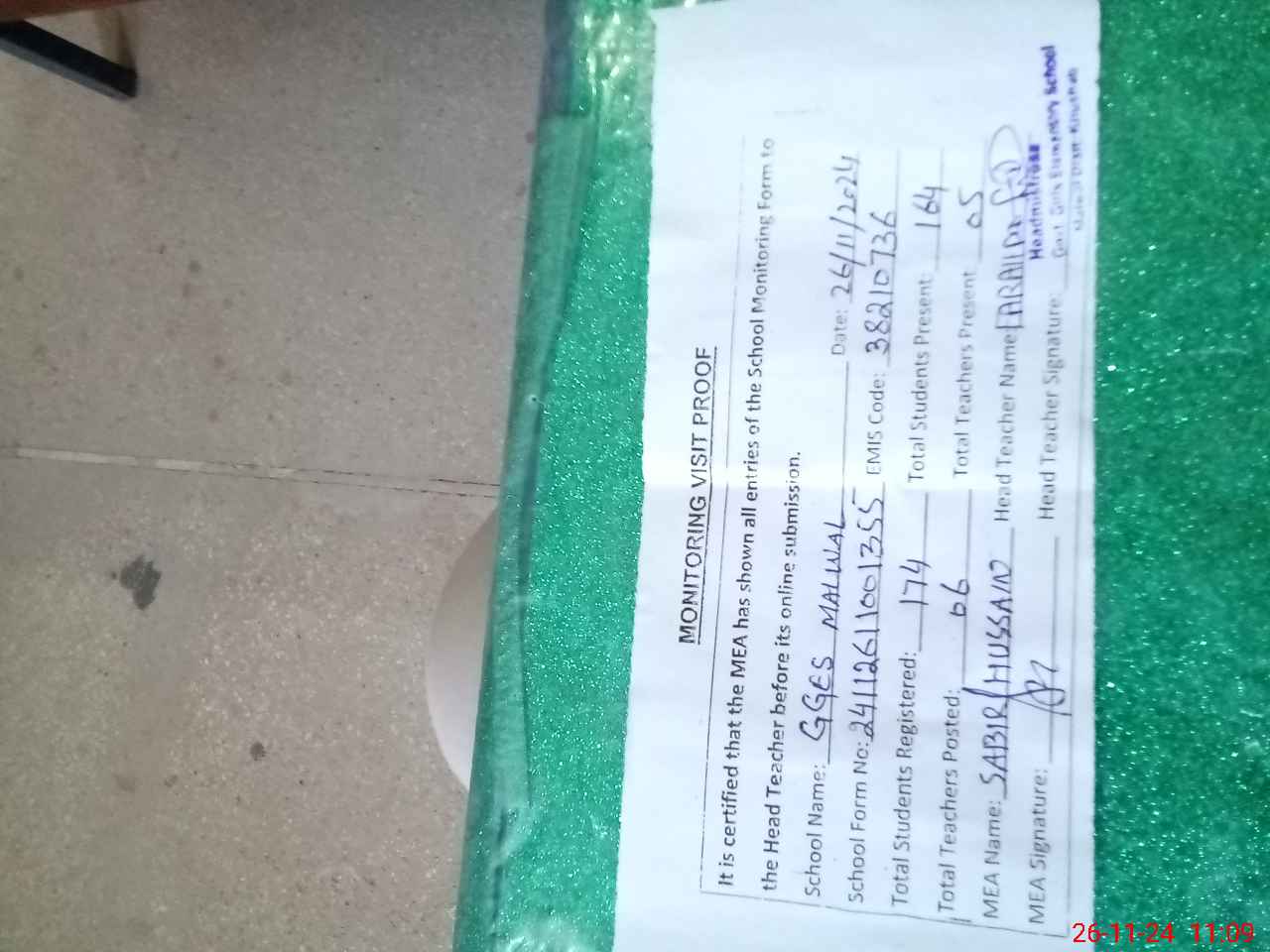 | Attendance Register | Head Teacher | MEA with School | Visit Proof |