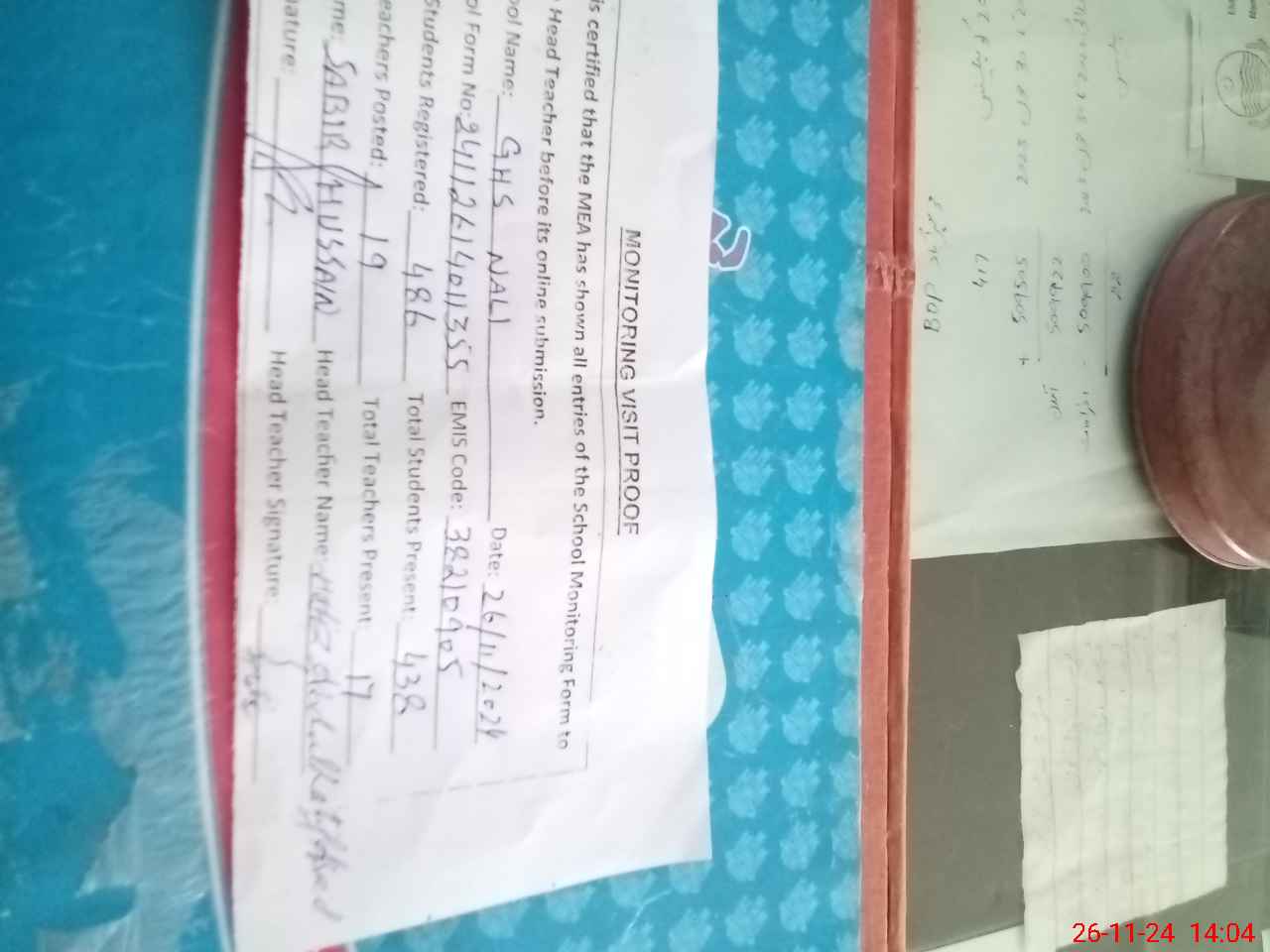 | Attendance Register | Head Teacher | MEA with School | Visit Proof |