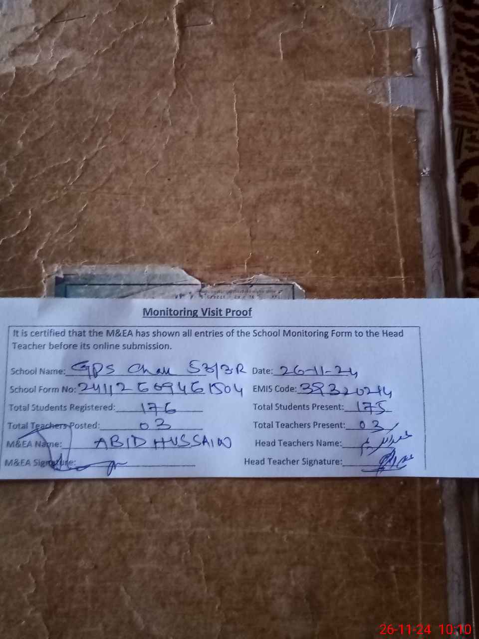 | Attendance Register | Head Teacher | MEA with School | Visit Proof |