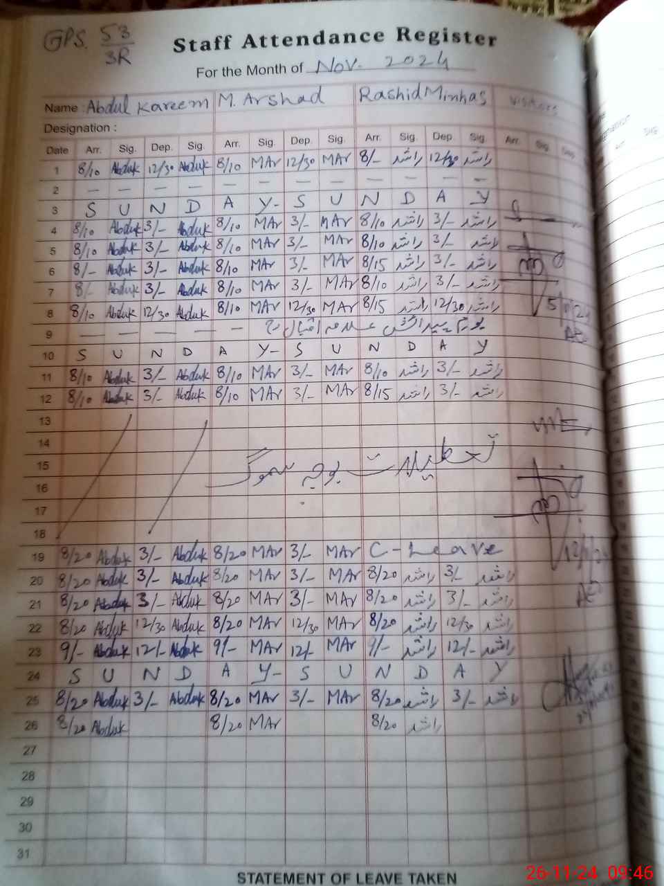 | CNIC | Full Name | Designation | R/C | Absence During Last Calender Month |