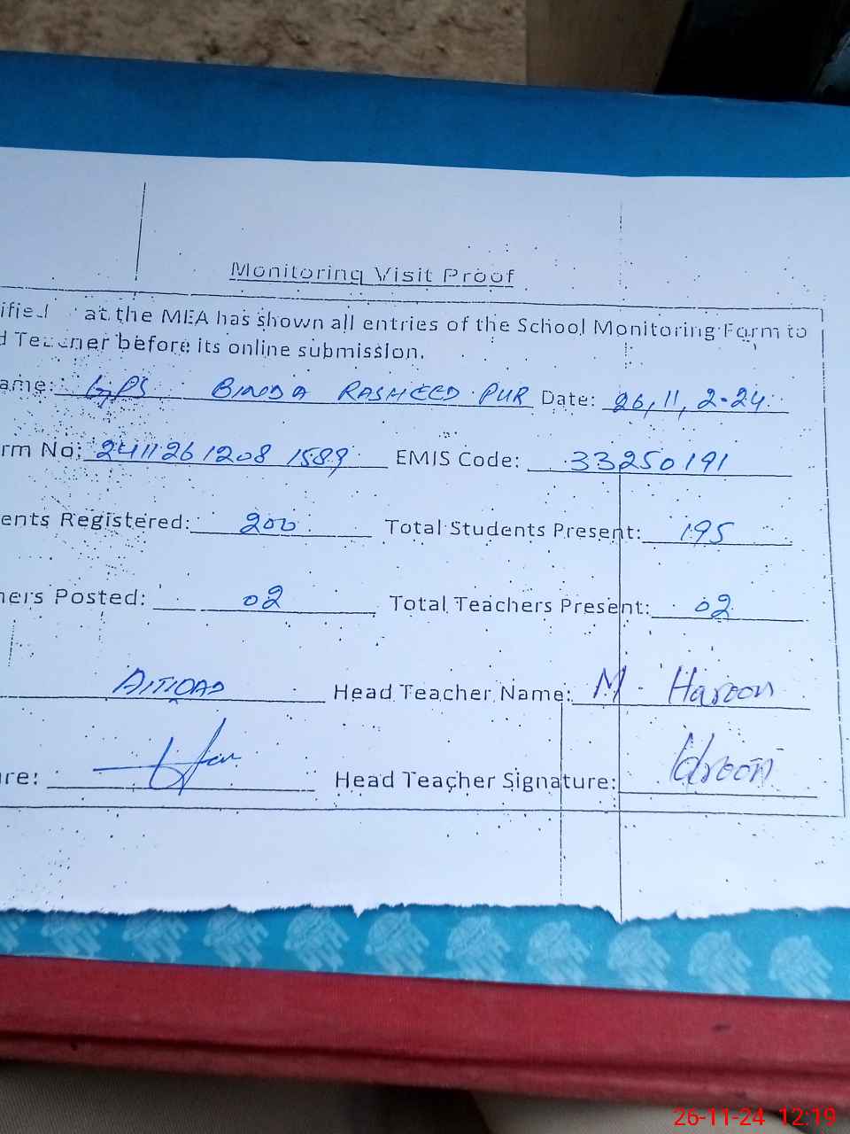 | EMIS Code: 33250191 | Name of School: GPS BINDA RASHEED PUR | |||