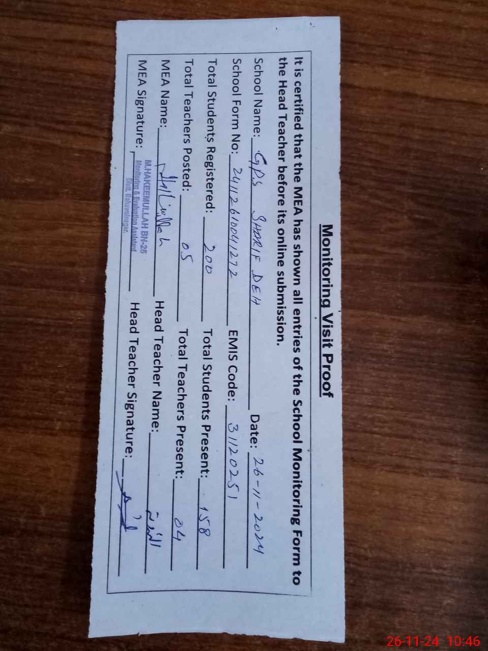 | Certified that this School was Inspected by the Undersigned MEA/DMO Today and the Information Stated Above is as Per Record. | |||||