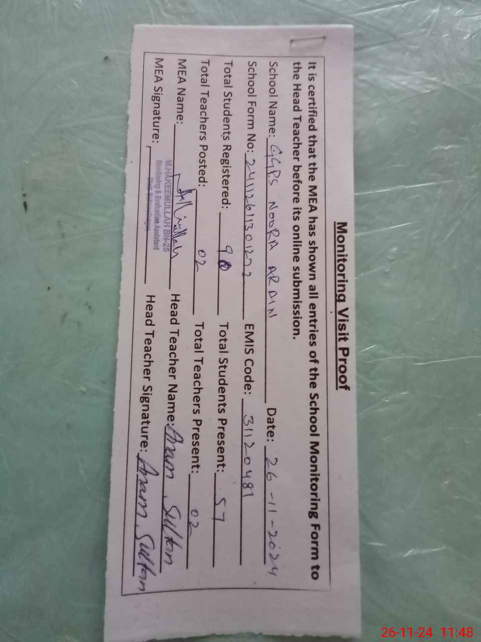 | EMIS Code: 31120481 | Name of School: GGPS NOORA ARAIN | |||