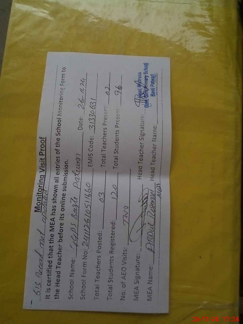 | Attendance Register | Head Teacher | MEA with School | Visit Proof |