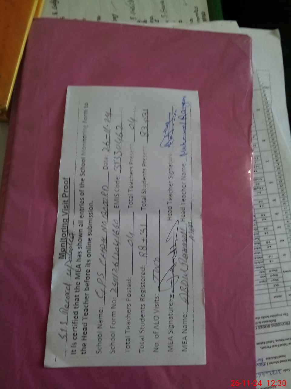 | Attendance Register | Head Teacher | MEA with School | Visit Proof |