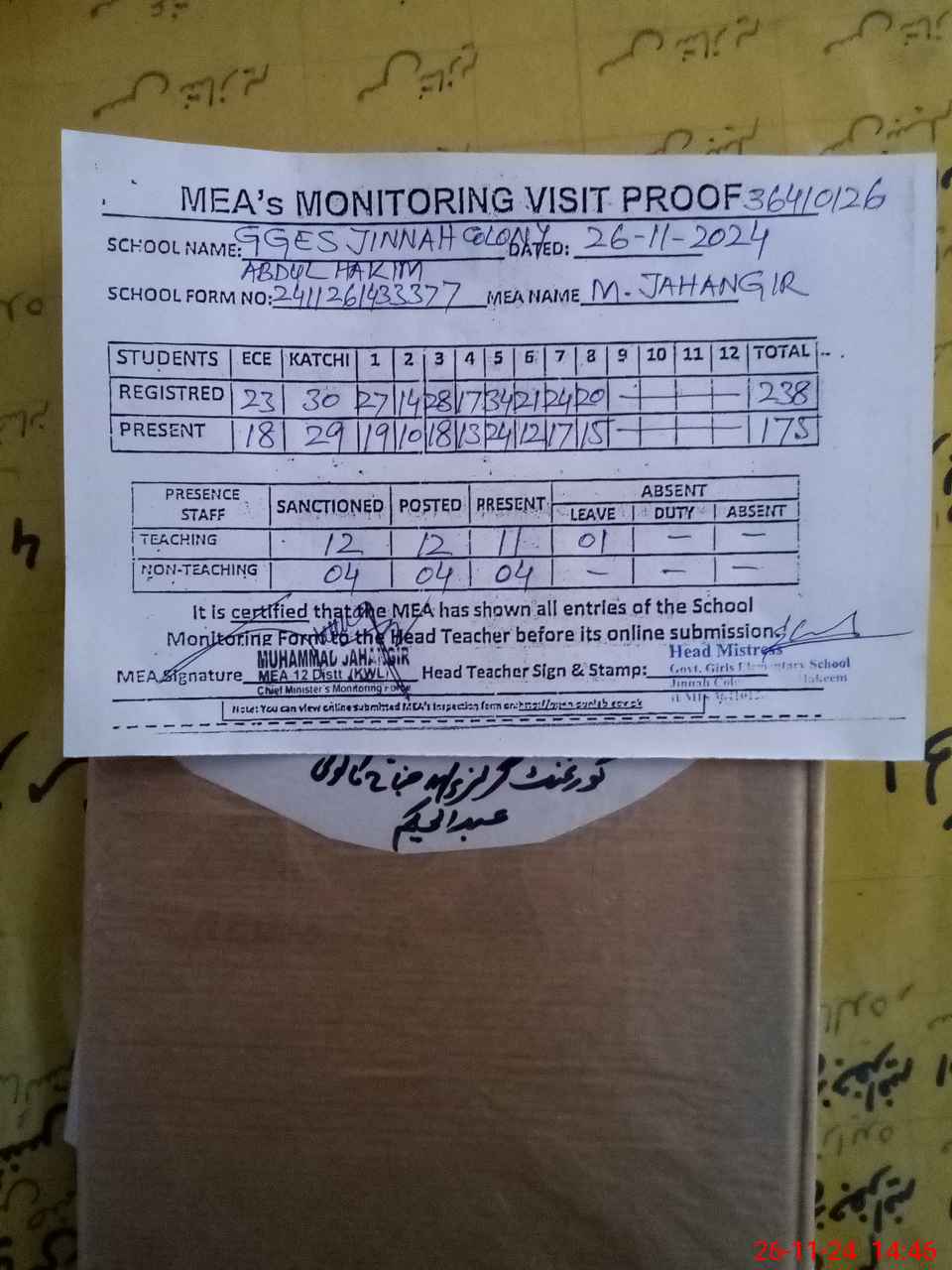 | Attendance Register | Head Teacher | MEA with School | Visit Proof |