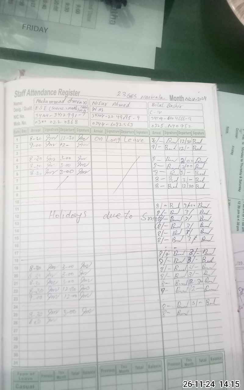 | CNIC | Full Name | Designation | R/C | Absence During Last Calender Month |