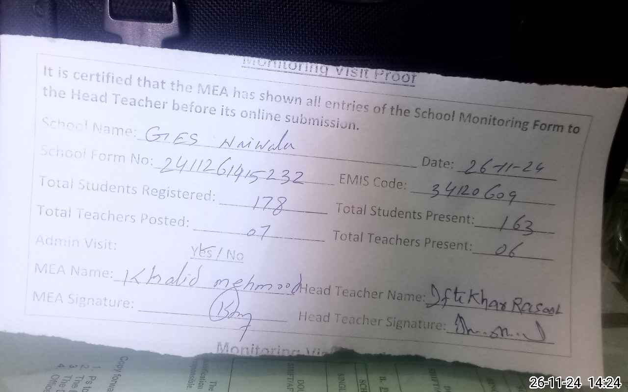 | Attendance Register | Head Teacher | MEA with School | Visit Proof |