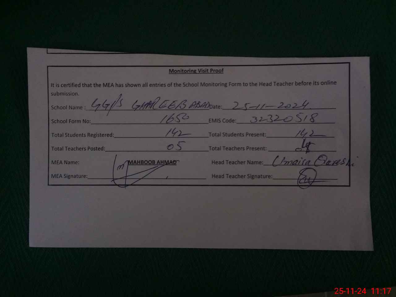 | Attendance Register | Head Teacher | MEA with School | Visit Proof |