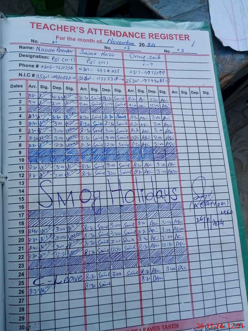 | CNIC | Full Name | Designation | R/C | Absence During Last Calender Month |