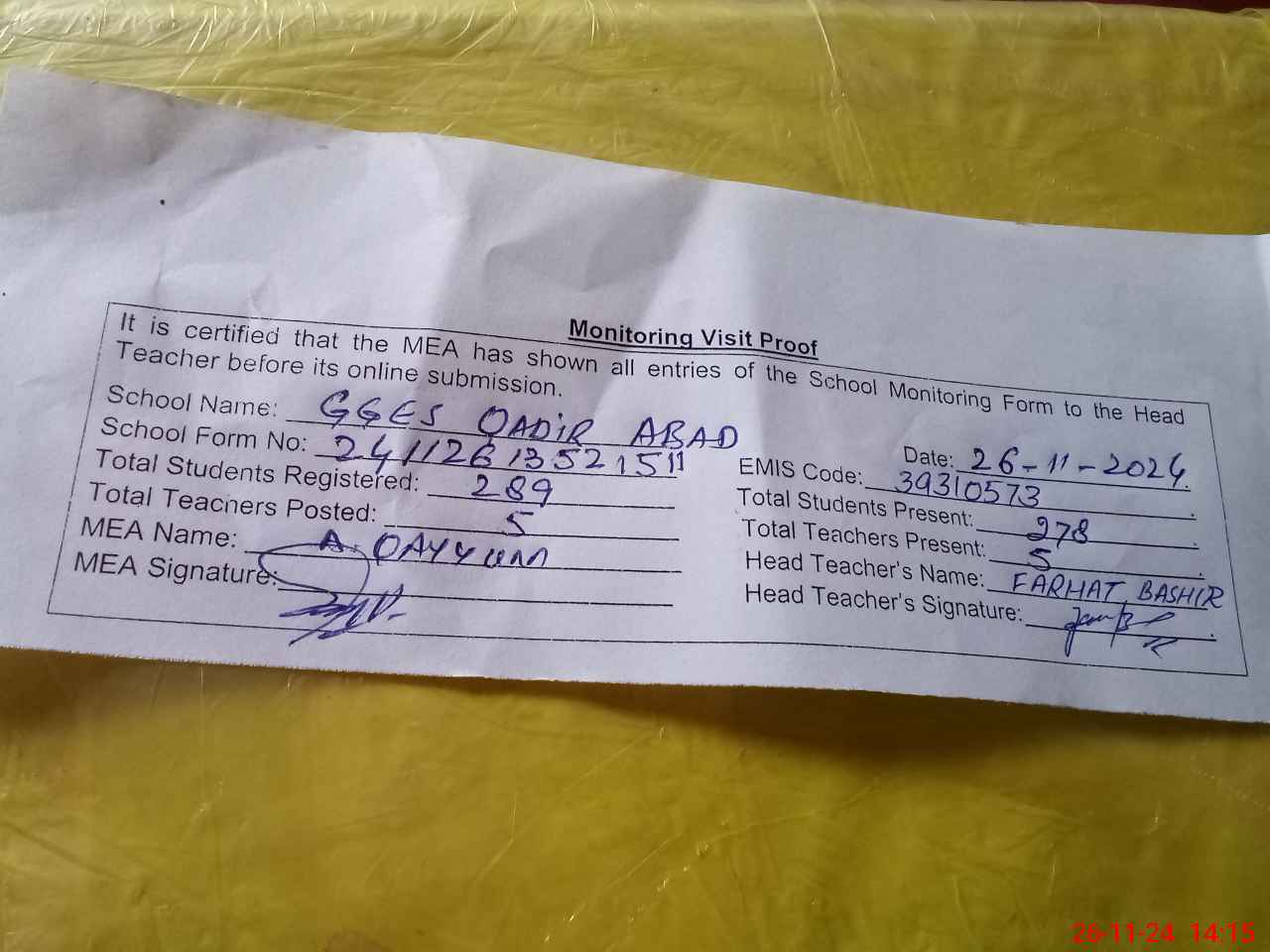 | EMIS Code: 39310573 | Name of School: GGES QADIR ABAD | |||