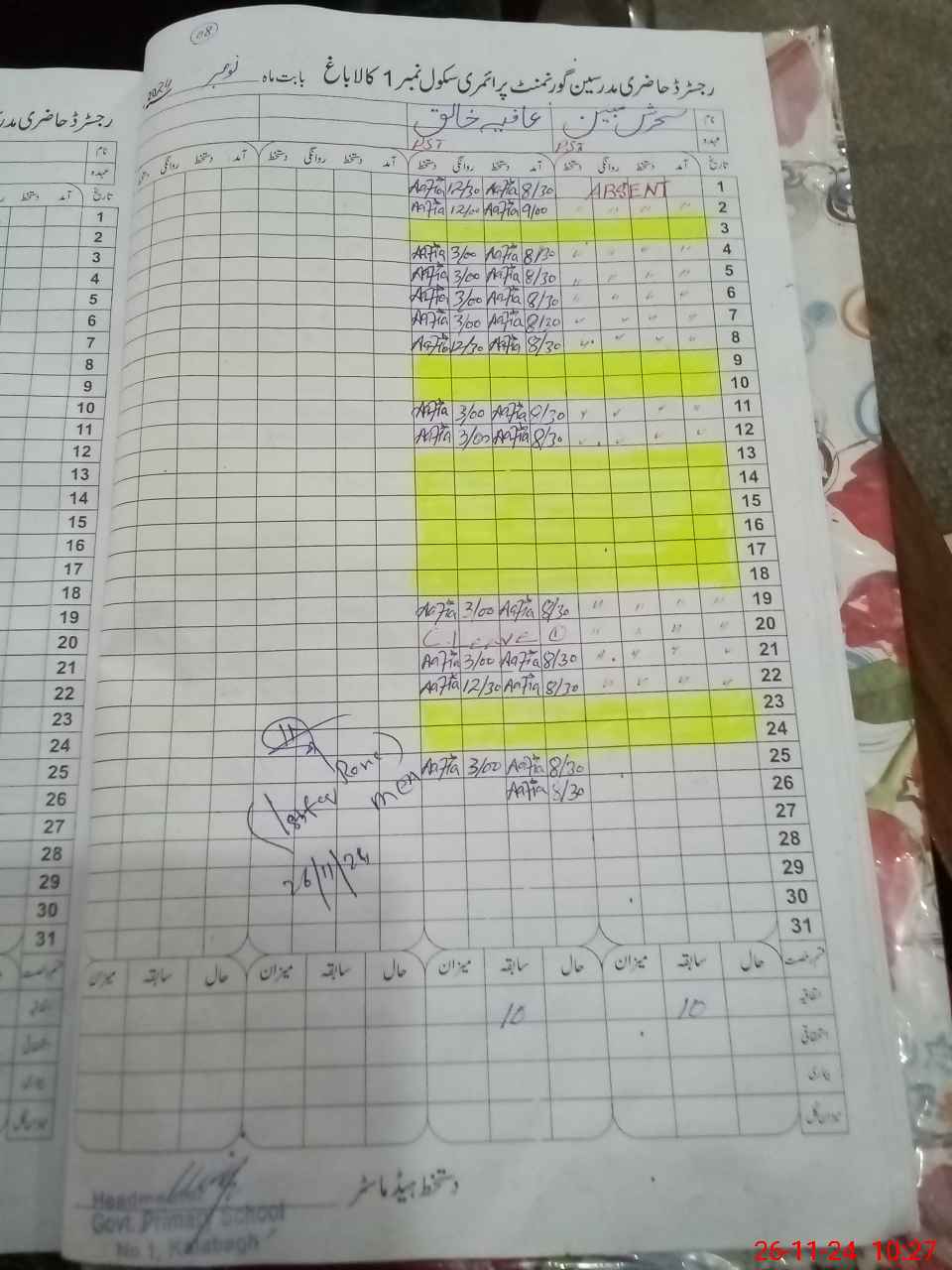 | Total no. of Classrooms: 6 No. of Classrooms Used for Teaching: 6 No. of Classrooms Storing Old Furniture, FTBs, etc: 0Comments if Any: Health official did not visit for Long time pst sehrish mubeen is absent since 4 Oct 2024 without any official leave |