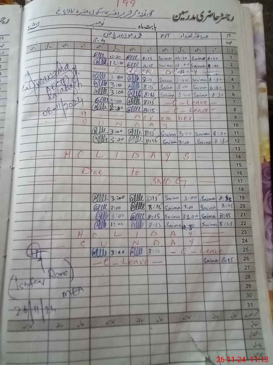 | Total no. of Classrooms: 3 No. of Classrooms Used for Teaching: 3 No. of Classrooms Storing Old Furniture, FTBs, etc: 0Comments if Any: Health official did not visit for Long time SG Aun Riaz is absent without any official leave |