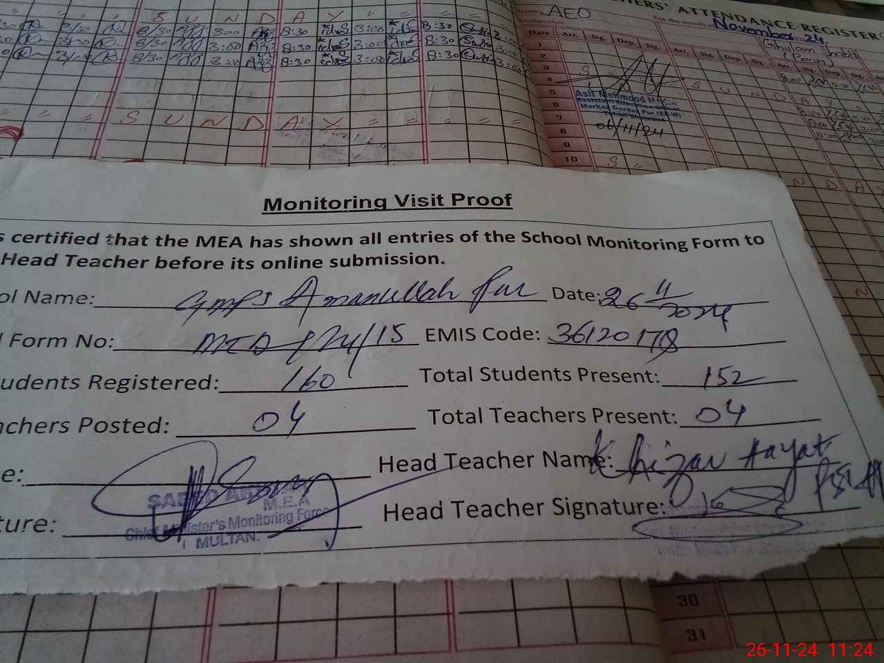 | Attendance Register | Head Teacher | MEA with School | Visit Proof |