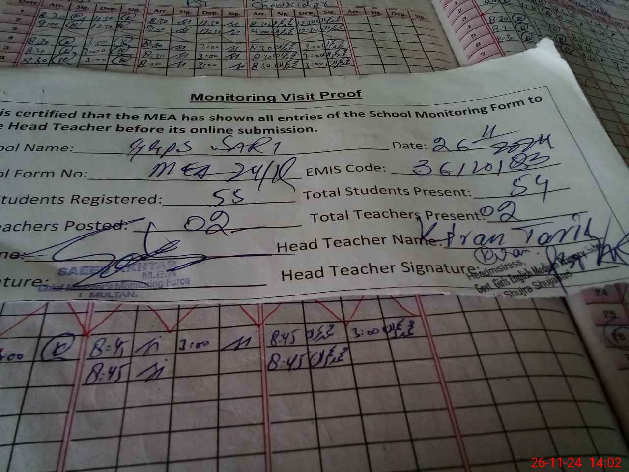 | Attendance Register | Head Teacher | MEA with School | Visit Proof |