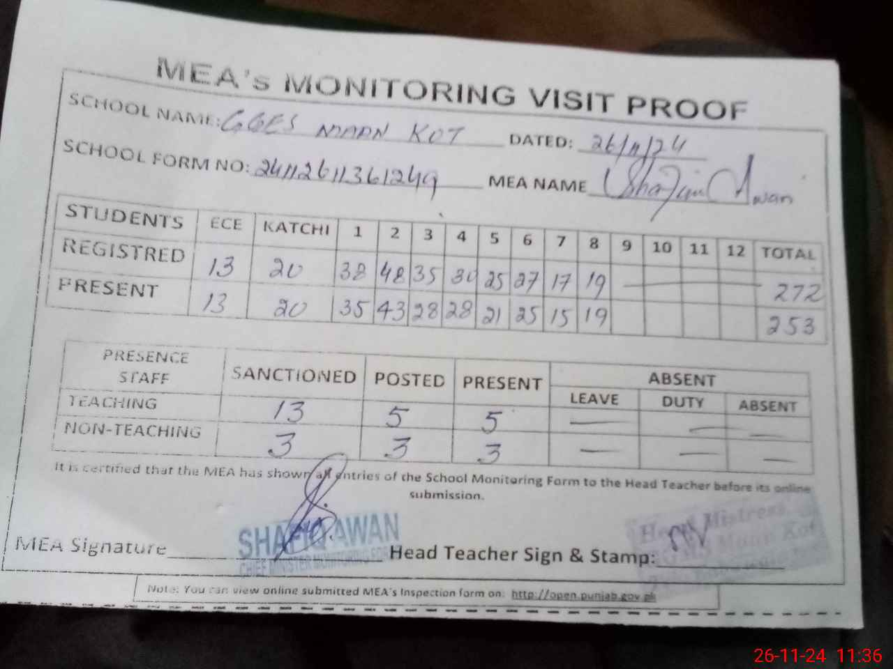 | Attendance Register | Head Teacher | MEA with School | Visit Proof |
