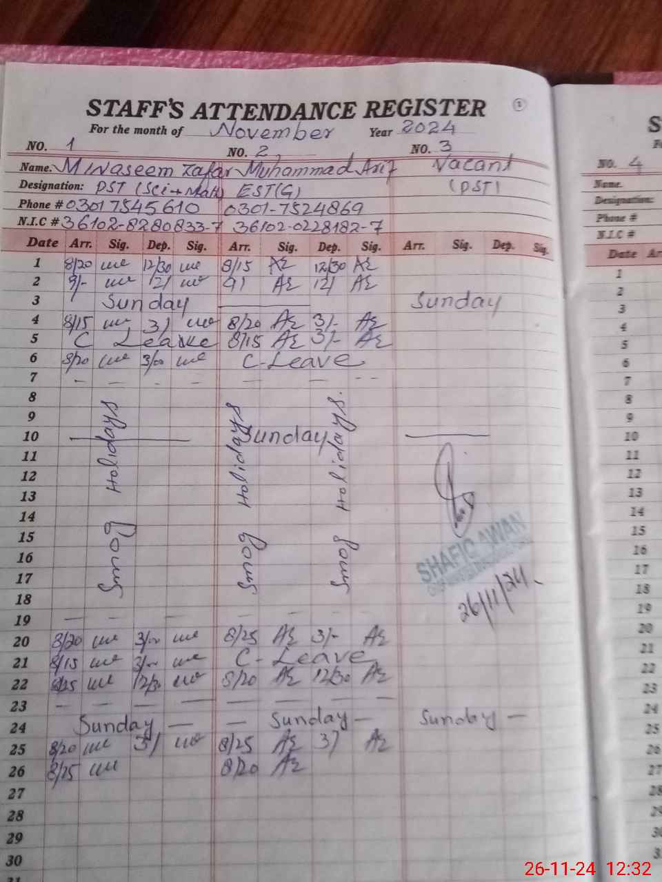 | CNIC | Full Name | Designation | R/C | Absence during last cal. month |