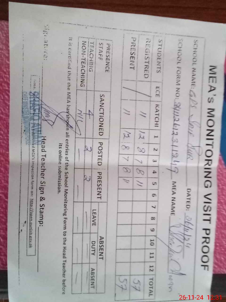 | Attendance Register | Head Teacher | MEA with School | Visit Proof |