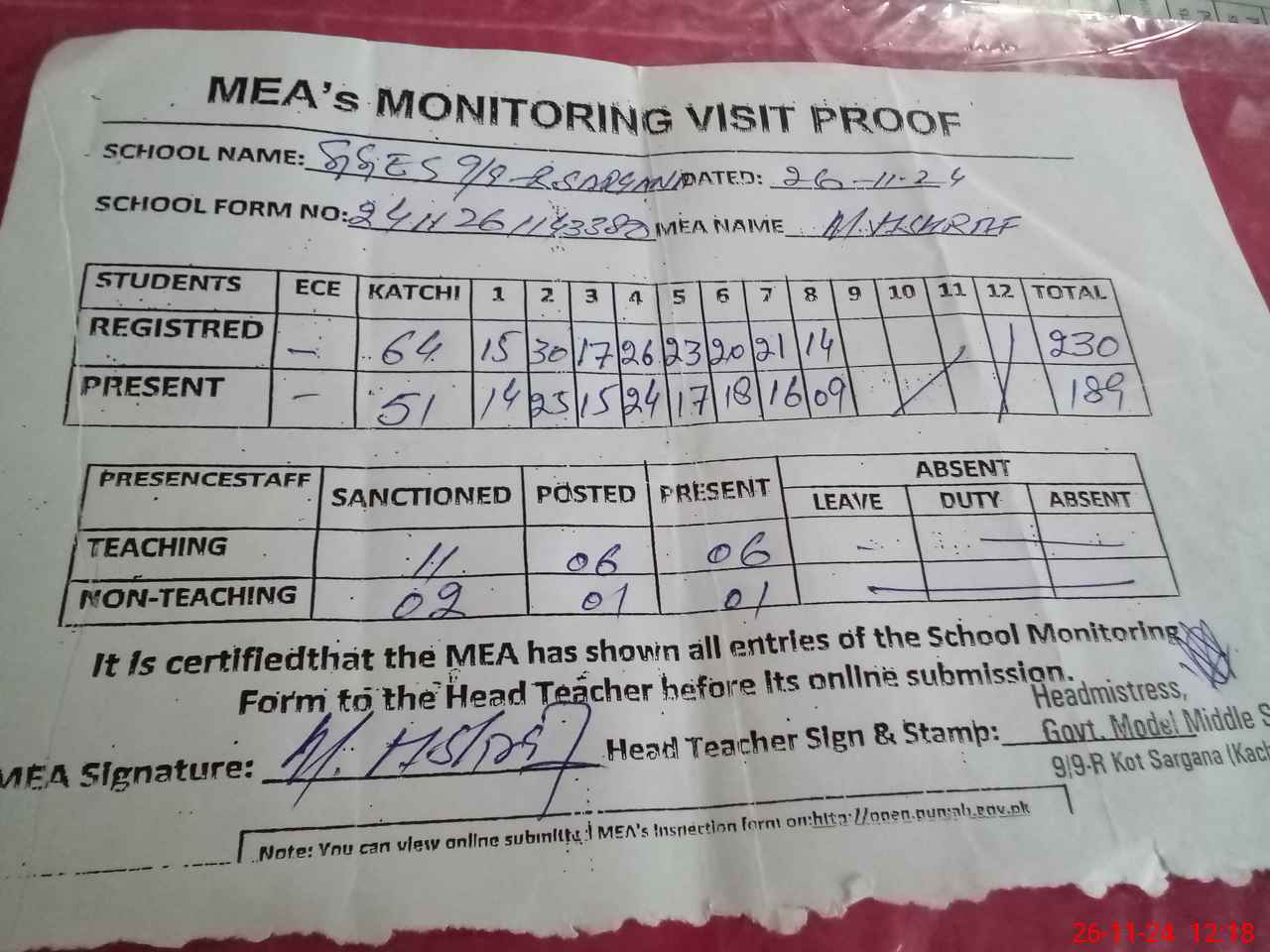 | Attendance Register | Head Teacher | MEA with School | Visit Proof |