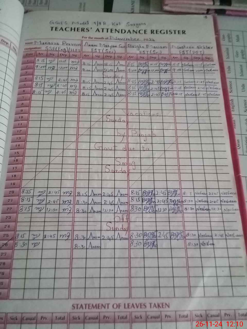 | Monitoring Date: 26-11-2024 | Start Time: 26-11-2024 11:43 AM | End Time: 26-11-2024 12:18 PM | Name of MEA: MU**** AS**** | |