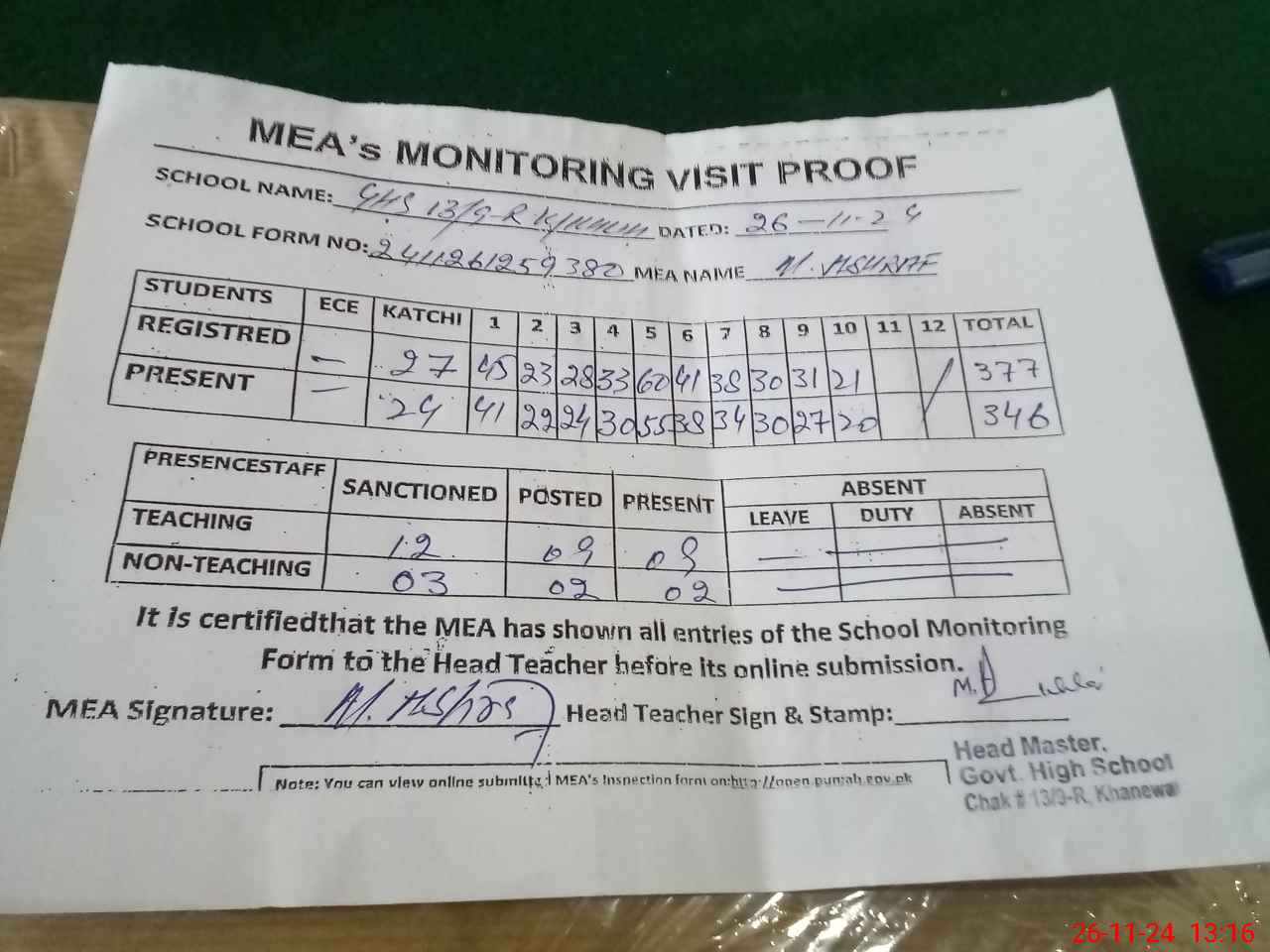 | Attendance Register | Head Teacher | MEA with School | Visit Proof |