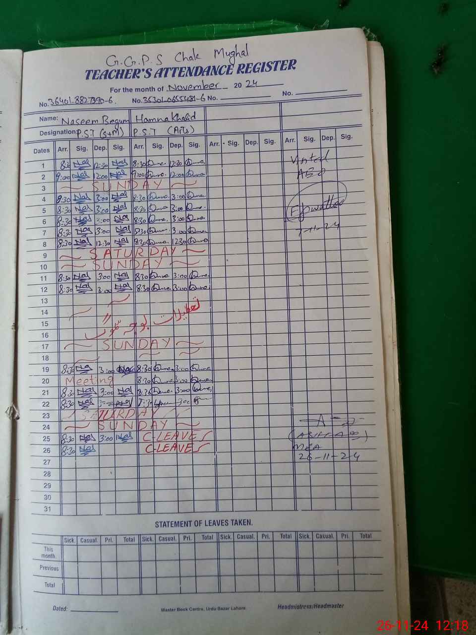 | Leave | Duty | Absent | Maternity | Medical | Ex- Pak |