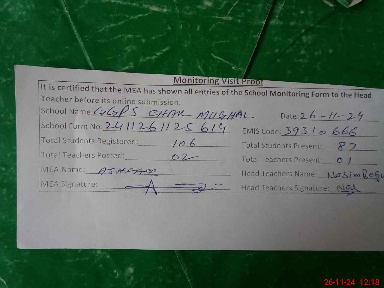 | EMIS Code: 39310666 | Name of School: GGPS CHAK MUGHAL | |||