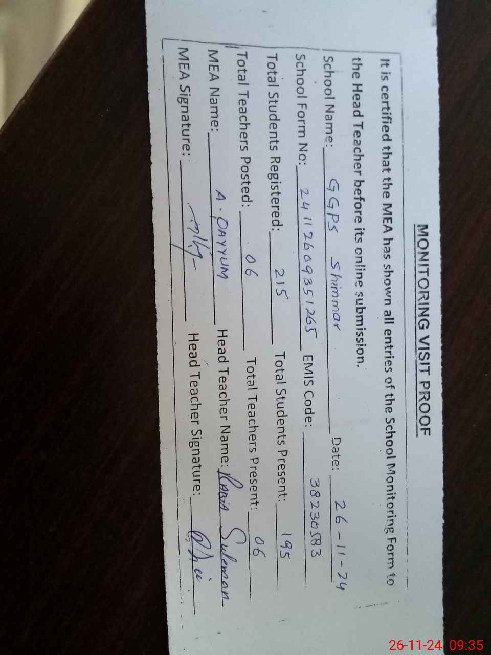 | Attendance Register | Head Teacher | MEA with School | Visit Proof |