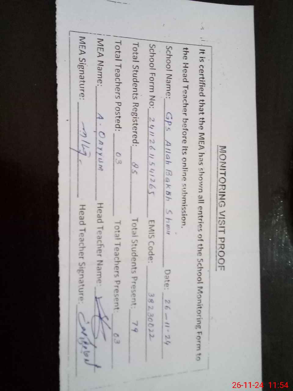 | EMIS Code: 38230022 | Name of School: GPS ALLAH BAKHSH SHUMAR | |||