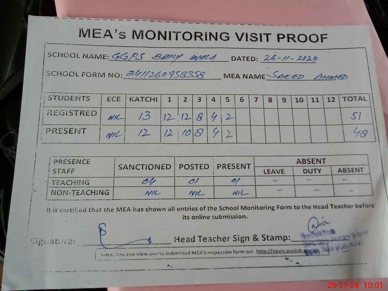 | Attendance Register | Head Teacher | MEA with School | Visit Proof |