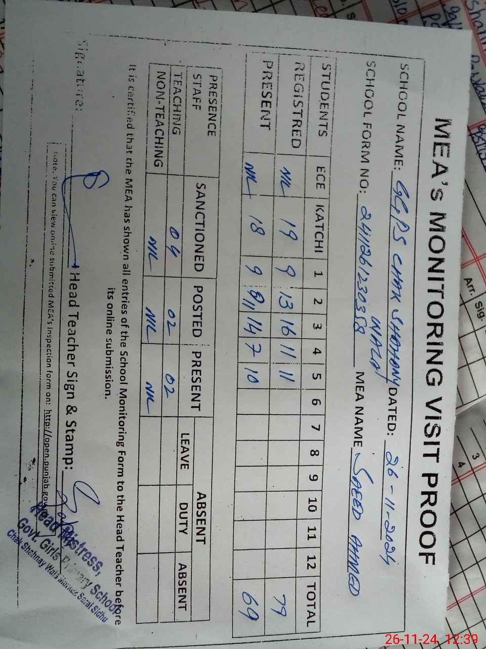 | Attendance Register | Head Teacher | MEA with School | Visit Proof |