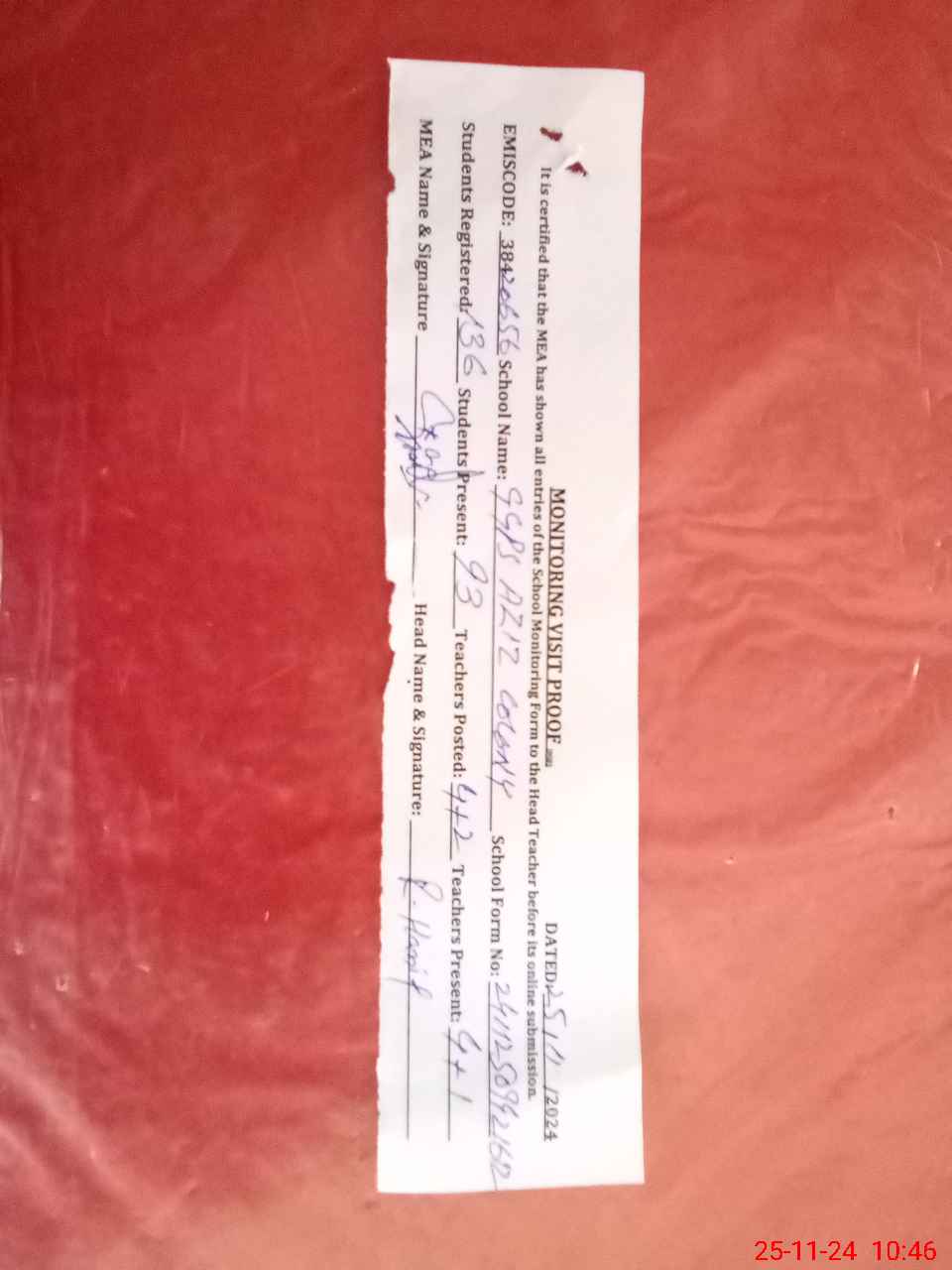 | Attendance Register | Head Teacher | MEA with School | Visit Proof |