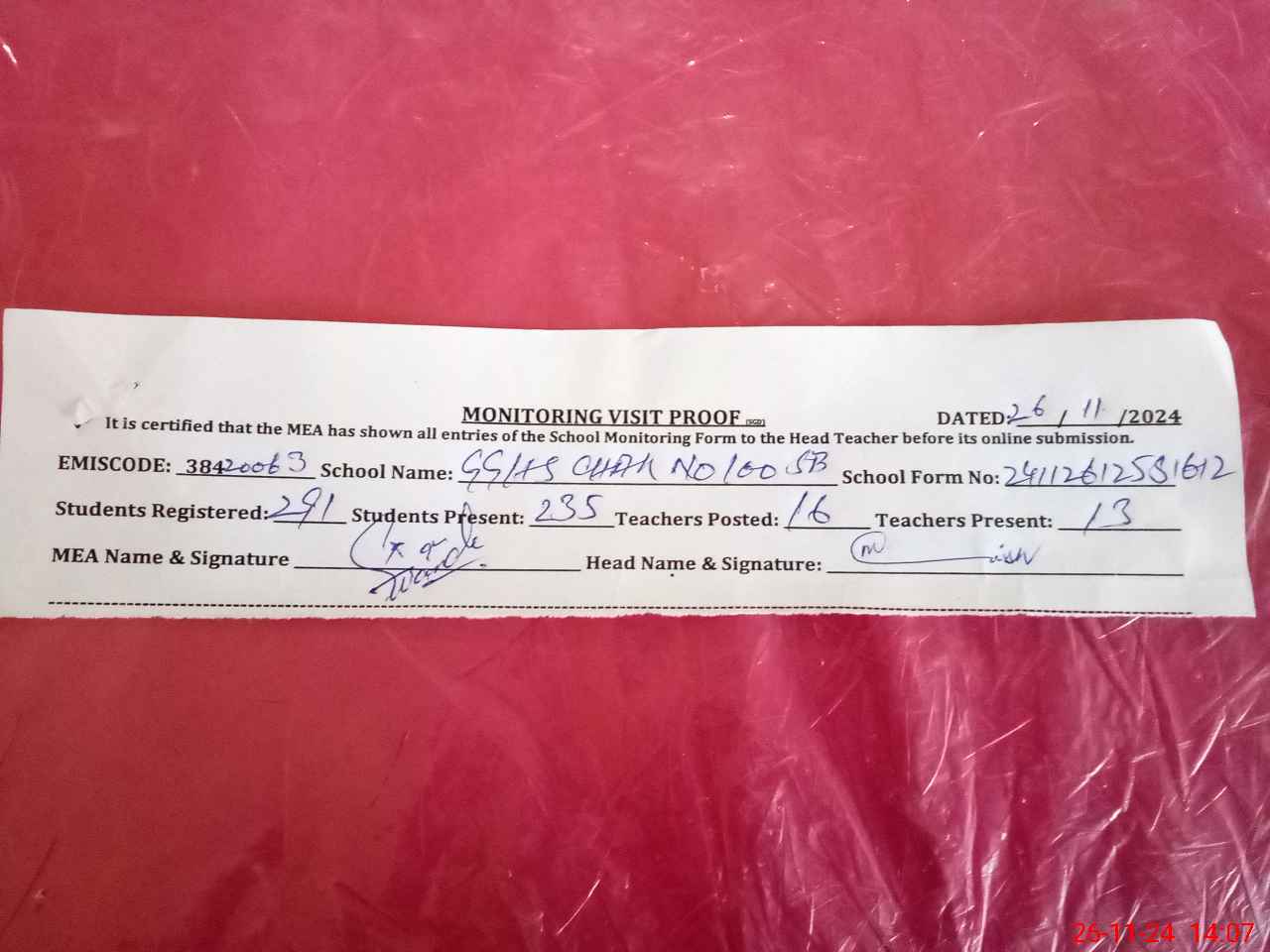 | EMIS Code: 38420063 | Name of School: GGHS CHAK NO.100 SB | |||