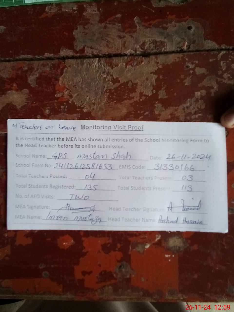| EMIS Code: 31330166 | Name of School: GPS MASTAN SHAH | |||
