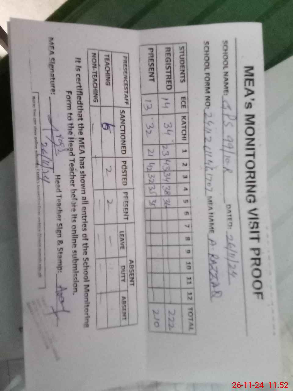 | Attendance Register | Head Teacher | MEA with School | Visit Proof |