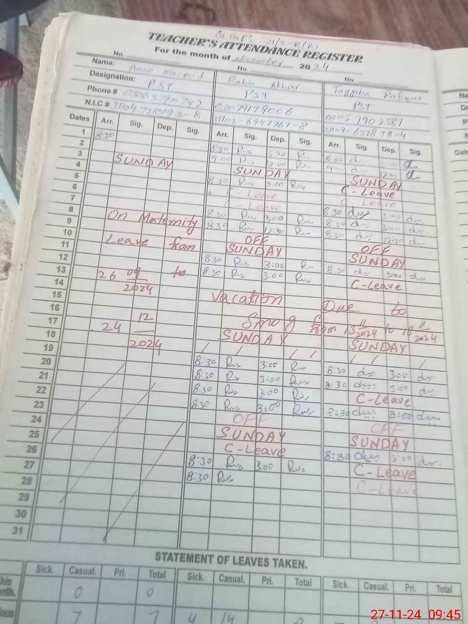 | 31**** | An**** Ma**** | PST | Regular | 0 | 0 | 0 | 0 | 0 | 0 | 0 | 0 | 0 | Maternity |