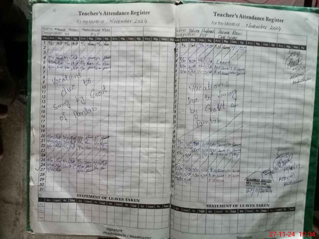 | Remarks (Use Separate Page if Required): NSB GRANTS RECORDS ARE NOT MAINTAINED BANK STATEMENTS ARE NOT AVAILABLE ONE TOILET FOUND NON FUNCTIONAL DUE TO MOTOR PUMP IS FITTED IN THIS TOILET THAT IS DANGEROUS AND NON FUNCTIONAL FTBS RECORDS ARE NOT AVAILABLE IN ECE ROOM ONE CLASS IS SITTING ECE KIT IS LYING IN HM OFFICE RANDOM CLASS KATCHI IS NOW IN CLASS THREE | |||||